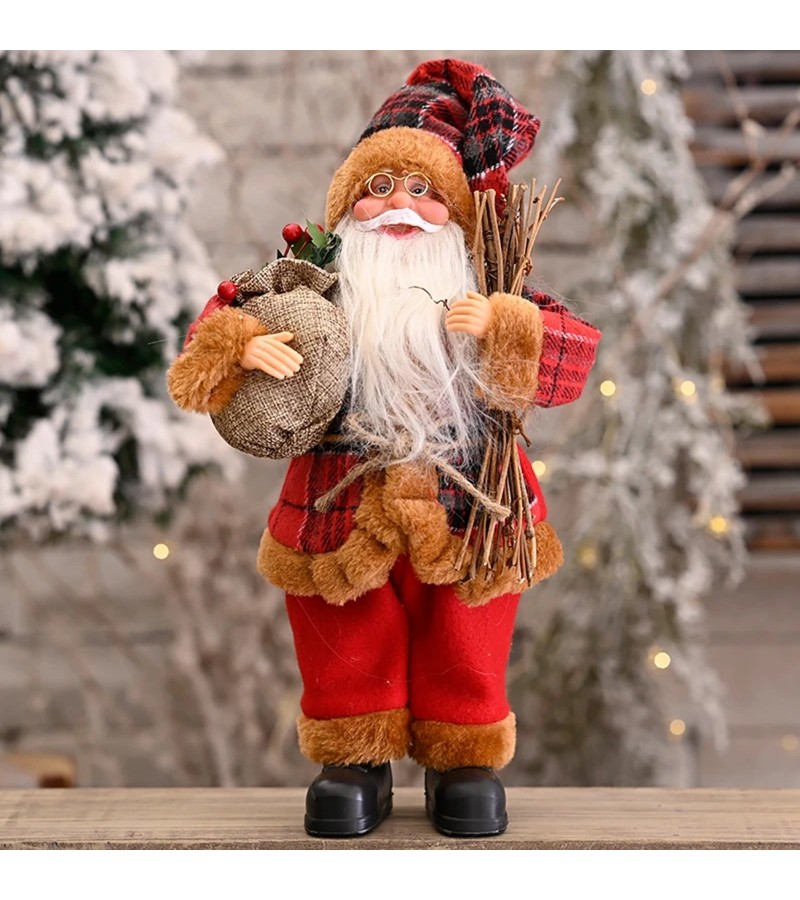 საახალწლო თოვლის ბაბუს დეკორაცია წითელი ჩაცმულობით და ხელში ტომარით. მოდელი SHSD-9043 არის სიმაღლეში 45 სმ.