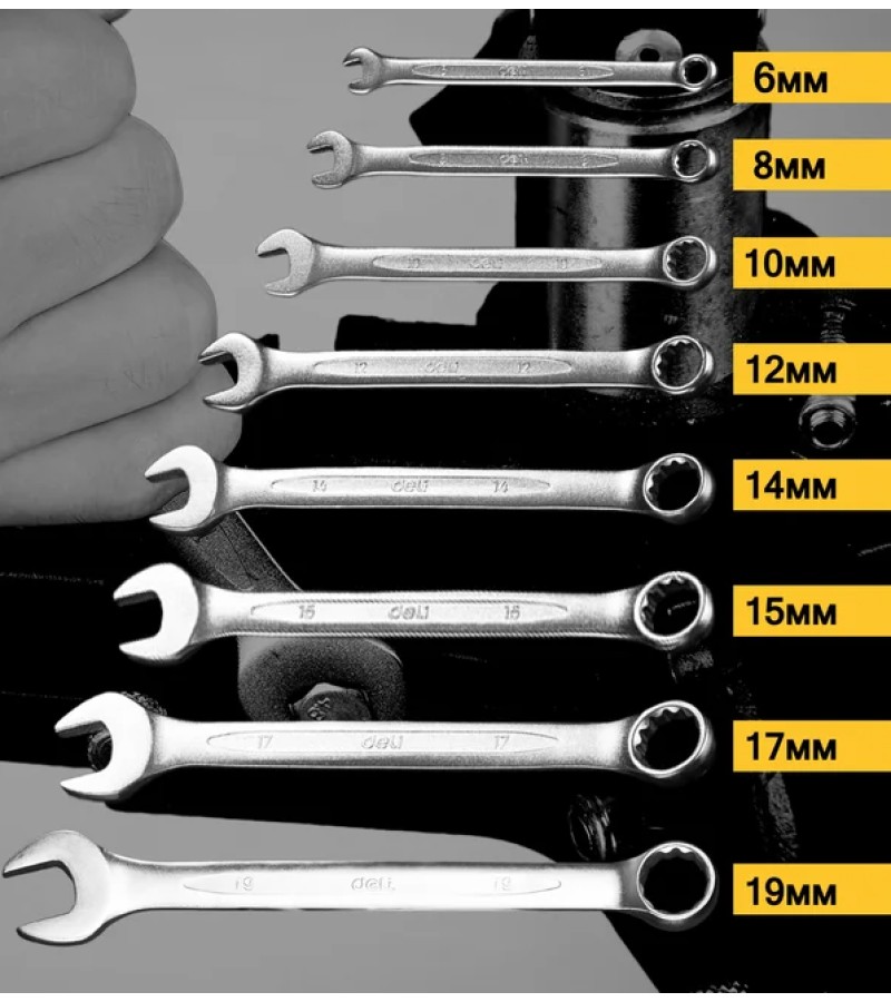 Deli DL130008A არის კომბინირებული ქანჩების უნივერსალური ნაკრები, რომელიც მოიცავს 8 ყველაზე ხშირად გამოყენებად ზომას და წარმოდგენილია პლასტმასის პრაქტიკულ ქეისში, რაც უზრუნველყოფს ხელსაწყოების ორგანიზებასა და დაცვას.