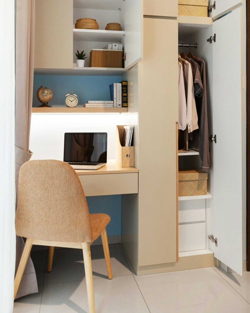 მაგიდისა და გარდერობის გაერთიანება - დღეს, როცა დისტანციურად მუშაობა ჩვეულებრივ მოვლენად იქცა, სამუშაო მაგიდისა და საგარდერობე სივრცის გაერთიანება სივრცის დასაზოგად იდეალური საშუალებაა. ამის ერთ-ერთი გზაა გარდერობის ერთი ნაწილის გამოყოფა თაროებით და გასაშლელი, ან დასაკეცი მაგიდით. ეს უკვე თქვენს ნებასა და სურვილზეა დამოკიდებული. ასე შეძლებთ თქვენი სამუშაო ადგილი ვიზუალურად ესთეტიკურად და თან მოხერხებულად იყოს ინტეგრირებული საძინებელში, თქვენსავე ტანსაცმლის კარადასთან