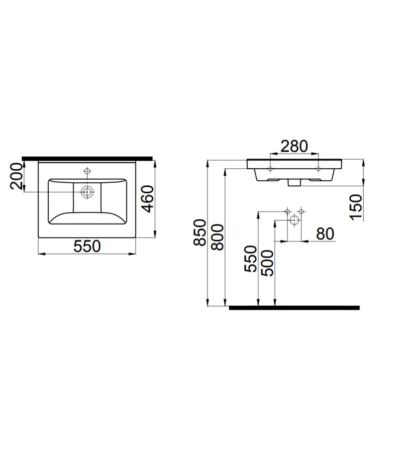 მართკუთხედი ფორმის, ჩასაშენებელი ხელსაბანი სააბაზანოსთვის.
