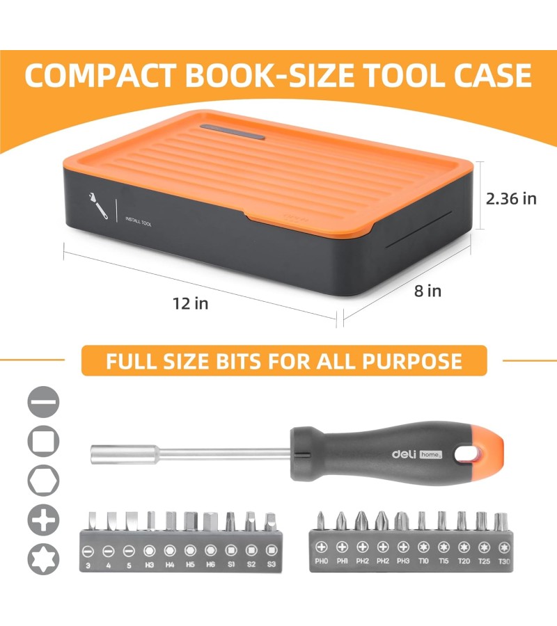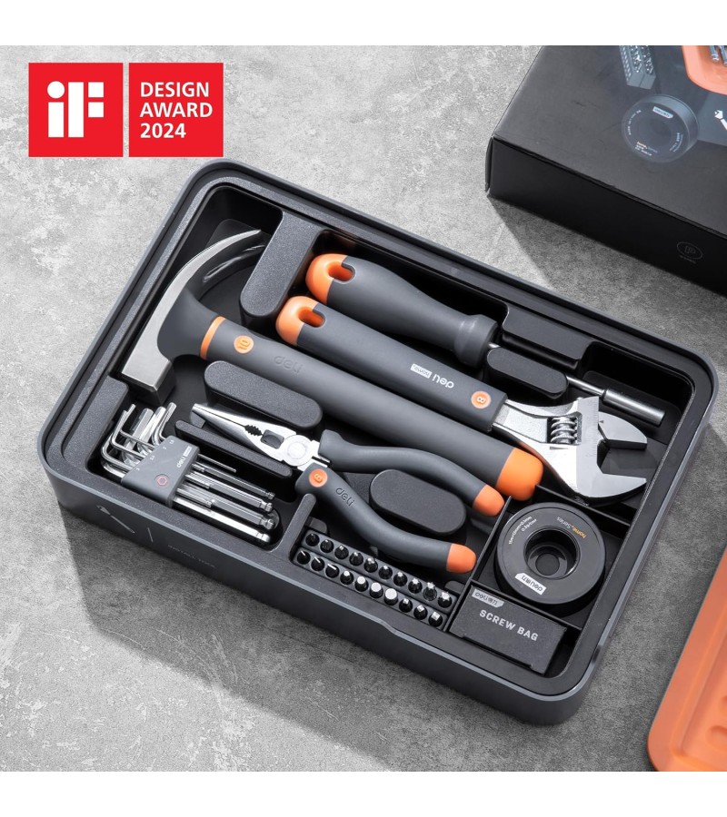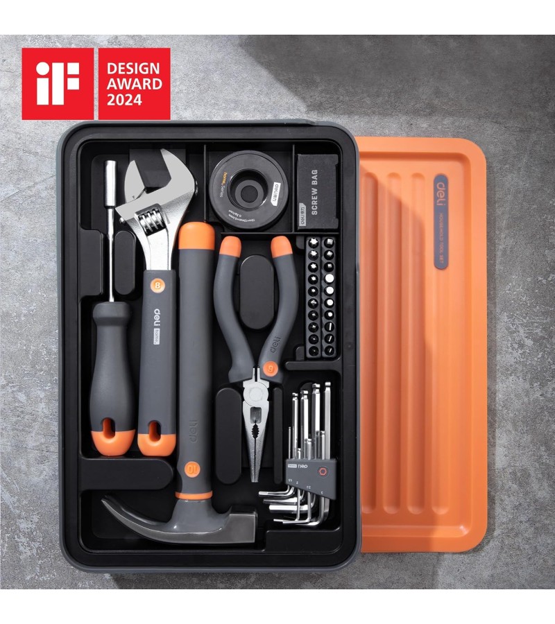 Deli H1001-E (34-ნაწილიანი) ხელსაწყოების ნაკრები არის იდეალური კომპლექტი სახლის მცირე რემონტისა და ყოველდღიური სამუშაოებისთვის. კომპაქტური, კარგად ორგანიზებული და მრავალფუნქციური – ის მოიცავს ყველა აუცილებელ ხელსაწყოს, რაც დაგჭირდებათ მარტივი ტექნიკური სამუშაოების შესასრულებლად.